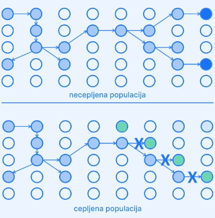 Osebe so prikazane s krogci. Patogen, ki povroča bolezen, se razširja med ljudmi, ki so prikazani s svetlo modrimi krogci. Kljub temu, da vsi ne zbolijo, bolezen razširjajo do oseb, ki so na to bolezen občutljive (temno modri), te osebe zbolijo in lahko umrejo. Spodnja shema prikazuje 4 ljudi, ki so se proti bolezni cepili (zeleni krogci). Ti ljudje razširjanje bolezni ustavijo in s tem zaščitijo ljudi, ki so na bolezen občutljivi. Iz sheme lahko sklepamo, da več ljudi, kot je cepljenih, višjo stopnjo kolektivne imunosti dosežemo. Z naraščajočo stopnjo kolektivne imunosti pa pada verjetnost razširjanja nalezljiva bolezni in zbolevanja. Kolektivna imunost deluje zgolj za bolezni ,ki so nalezljive, torej se prenašajo iz osebe na osebo. Primer, kjer kolektivna imunost ni možna, je tetanus. Bakterijo, ki povzroča tetanus, najdemo v zemlji. Ljudje, ki bi bili bakteriji izpostavljeni in niso cepljeni, bi se s tetanusom okužili, ne glede na to, koliko ljudi v skupnosti je cepljenih proti tetanusu.